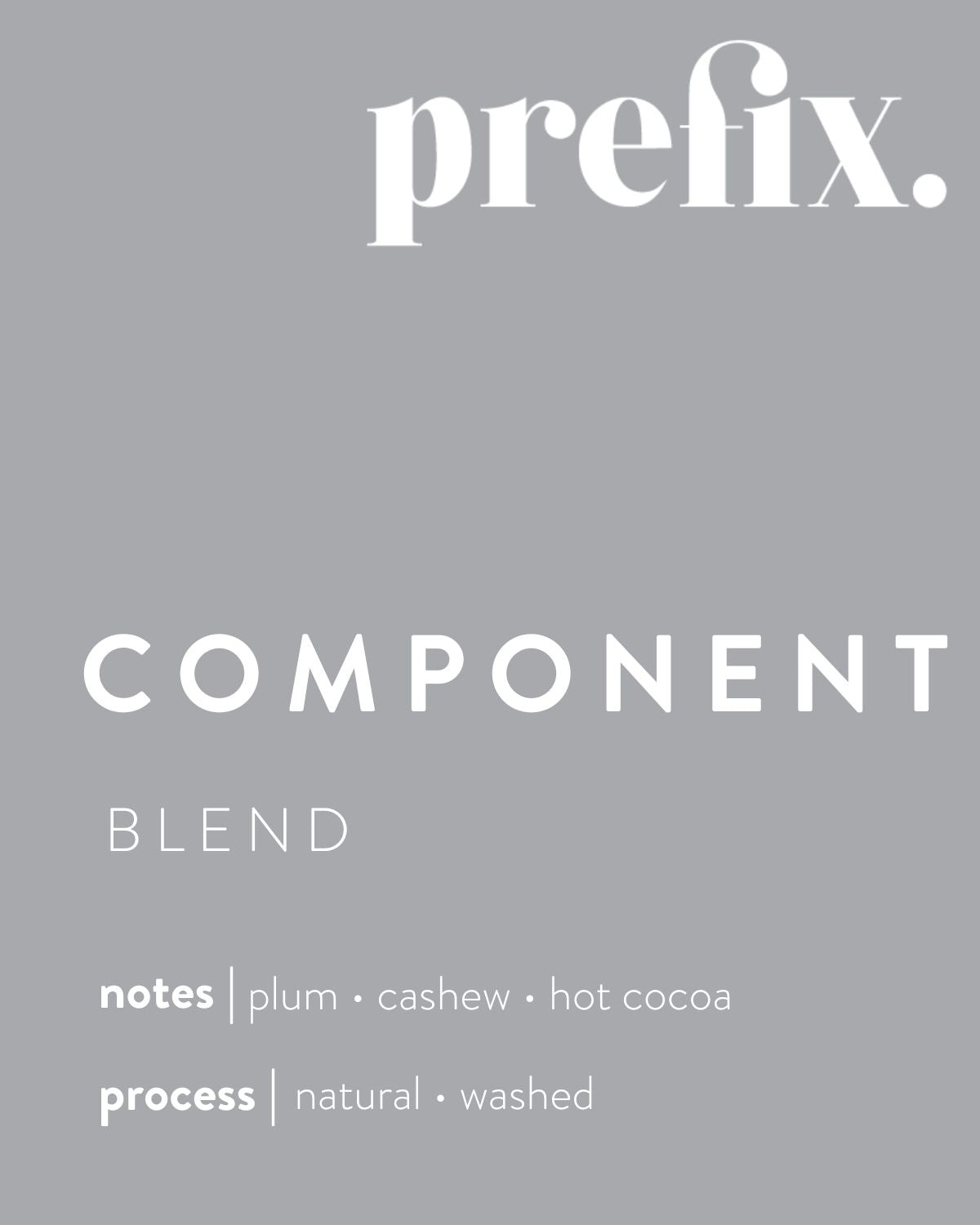 Because of the varying availability of coffee, the coffees that make up Component will periodically change, whilst maintaining (or improving) the same flavor profile. Currently Component is a two-part blend of a pulped natural Brazil and a washed Guatemala.